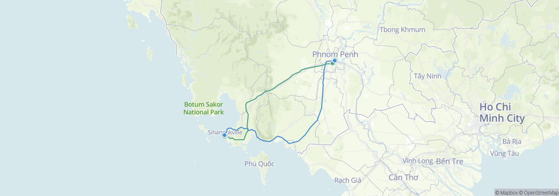 The travel distance between Phnom Penh and Sihanoukville is 230 km. There are two options to travel from Phnom Penh to Sihanoukville: taking a train or a bus.